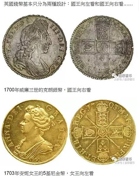 這一時期的英國錢幣整體比較單調,歷任國王的肖像變化不大,錢幣背面紋章的設計也比較一致。粗略地劃分,18世紀英國錢幣基本只分為兩種設計:國王向左看和國王向右看……