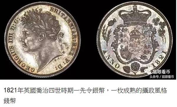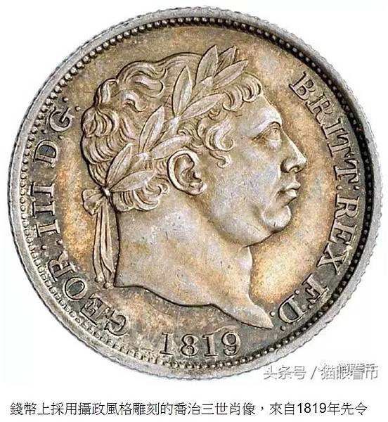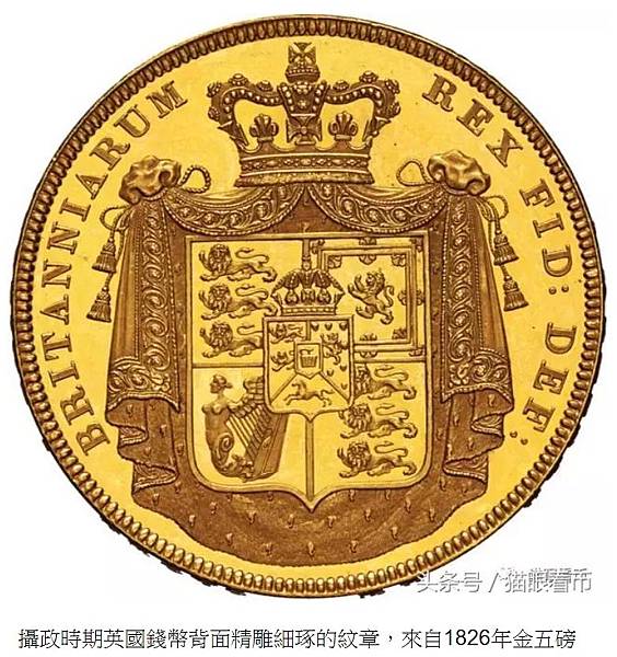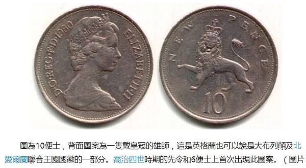 圖為10便士,背面圖案為一隻戴皇冠的雄師,這是英格蘭也可以說是大布列顛及北愛爾蘭聯合王國國徽的一部分。喬治四世時期的先令和6便士上首次出現此圖案。(圖片來源:英國那些事)