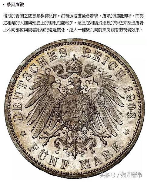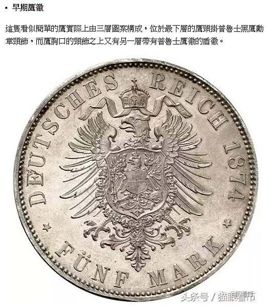 在整個帝國歷史上,這個著名的鷹徽有過一次調整,前後兩版鷹徽分別就是國內所說的「短翅鷹」和「長翅鷹」。這個鷹徽在設計上借鑑了普魯士王國在帝國統一之前所使用的鷹徽,但結構更加複雜一些。