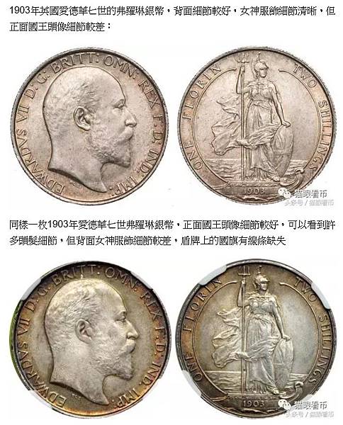 同樣一枚1903年愛德華七世弗羅琳銀幣,正面國王頭像細節較好,可以看到許多頭髮細節,但背面女神服飾細節較差,盾牌上的國旗有線條缺失