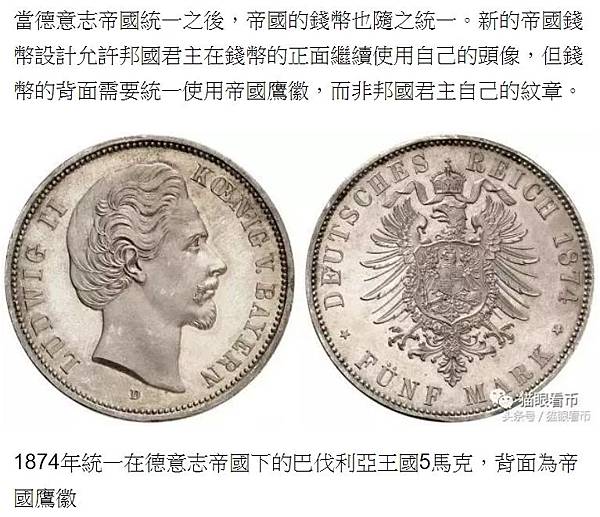 1874年統一在德意志帝國下的巴伐利亞王國5馬克,背面為帝國鷹徽