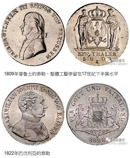 與英國錢幣不同,此時的德國錢幣在工藝和藝術水平上不斷地進步。隨着機械技術的普及,德國錢幣的做工突破了18世紀技術的限制,在制坯和衝壓工藝上逐漸趕上了英國。