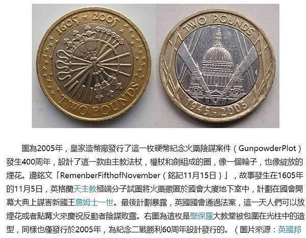 圖為2005年,皇家造幣廠發行了這一枚硬幣紀念火藥陰謀案件(GunpowderPlot)發生400周年,設計了這一款由主教法杖,權杖和劍組成的圈,像一個輪子,也像綻放的煙花。邊銘文「RemenberFifthofNovember(銘記11月15日)」,故事發生在1605年的11月5日,英格蘭天主教極端分子試圖將火藥藏匿於國會大廈地下室中,計劃在國會開幕大典上謀害新國王詹姆士一世。最後計劃暴露,英國國會通過法案,這一天人們可以放煙花或者點篝火來慶祝反動者陰謀敗露。右圖為這枚是聖保羅大教堂被包圍在光柱中的造型,同樣也僅發行於2005年,為紀念二戰勝利60周年設計發行的。(圖片來源:英國邦利)