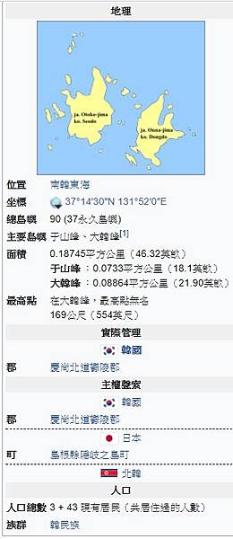竹島,日本則稱之為竹島(日語:竹島/たけしま Takeshima */?),是位於南韓東海的兩個島嶼和礁岩群,座標為北緯37度15分、東經131度52分,目前由大韓民國實際控制[2],行政區域屬於南韓慶尚北道鬱陵郡。日本及北韓亦主張擁有其主權,日本將其編入島根縣隱岐之島町,但自1952年以來未對其有過實效控制。雖然南韓和日本均宣稱最早勘探該島,但兩國之間仍存在較大的領土爭議。