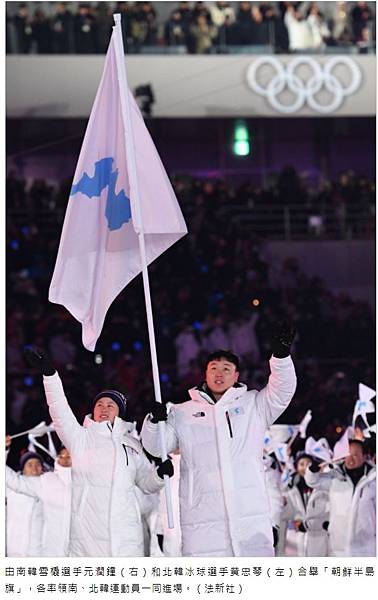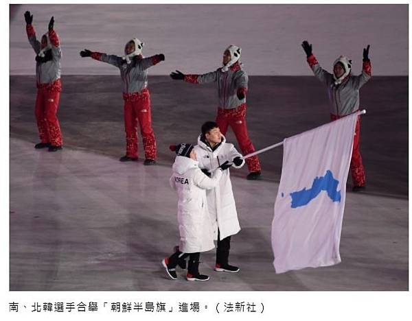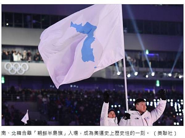 法新社和「朝日新聞」報導,9日在南韓平昌舉行的冬季奧運開幕典禮,南北韓已經達成共識,將在統一旗之下共同進場,並且合組女子冰球隊。統一旗上面印的是朝鮮半島的淡藍色剪影。