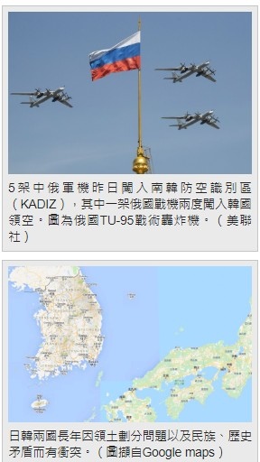《韓聯社》報導,俄羅斯軍機昨日飛入獨島上空,南韓軍機也隨即派機開火警示。日本政府則主張,獨島屬於日本國土,應由日方出面負責,韓方僅需就俄國侵入領空問題做出應對。