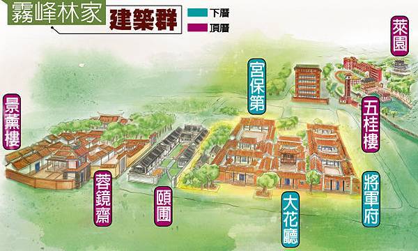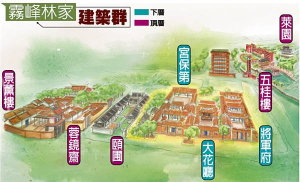 霧峰林家古厝在一九八五年被內政部指定為省轄二級古蹟(現為國定古蹟),是全台最大古蹟群。包括下厝的草厝、宮保第、大花廳、二房厝(將軍府)及二十八間建築物;頂厝的景薰樓、蓉鏡齋、頤圃及萊園,揉合傳統漳州、洋式及唐式風格,有如台灣傳統建築的百科全書。
