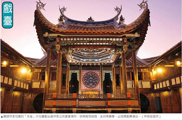 ▲霧峰林家花園的「本堂」大花廳戲台是林家公共宴會場所,族親每有結婚、生日等喜事,必招聘戲團演出。(林振廷提供)