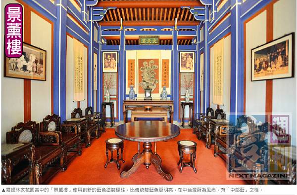 ▲霧峰林家花園當中的「景薰樓」使用創新的藍色塗裝樑柱,比傳統靛藍色更明亮,在中台灣蔚為風尚,有「中部藍」之稱。