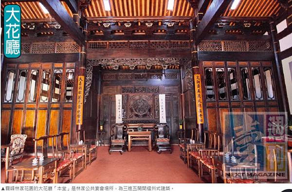 ▲霧峰林家花園的大花廳「本堂」是林家公共宴會場所,為三進五開間福州式建築。