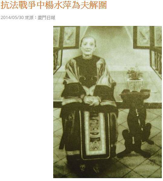 林朝棟是台灣霧峰林家的著名將領,以英勇著稱,是台灣抗法抗日的功臣。不僅如此,其夫人也是巾幗不讓鬚眉。近日,本報熱心讀者林先生向我們提供了一份記載林朝棟夫人楊水萍(見配圖)抗法戰爭時英勇救夫的珍貴歷史資料。