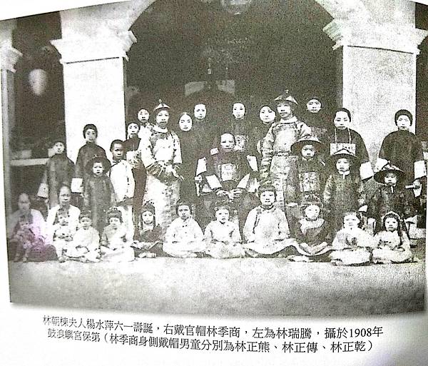 ▲1908年,台中望族霧峰林家第六代、台灣清治時期將領林朝棟的妻子楊水萍於61歲壽誕與家人合影,後排戴官帽為其子林祖密。(翻攝自林祖密將軍傳奇)