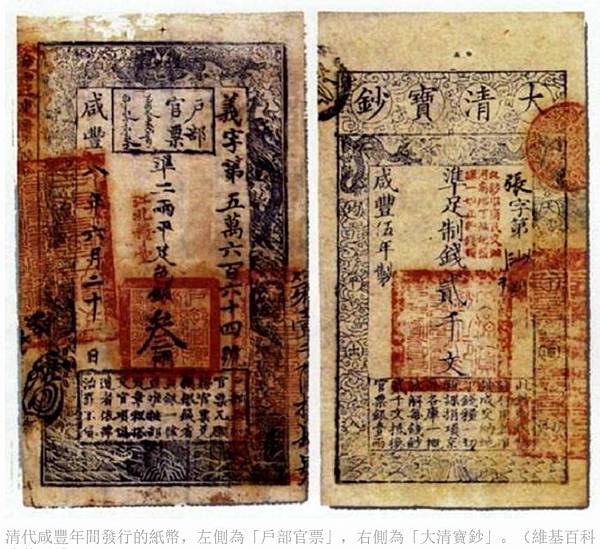 清代咸豐年間發行的紙幣,左側為「戶部官票」,右側為「大清寶鈔」。(維基百科公共領域)