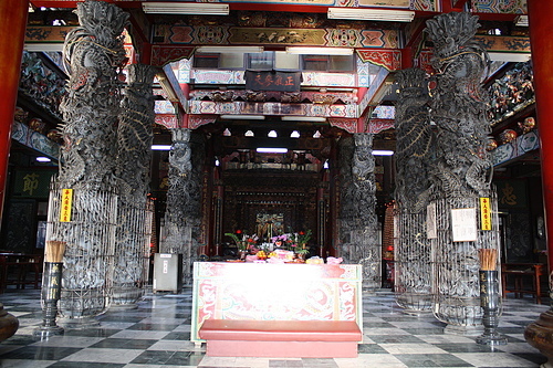 大殿正面望去,兩側龍鳳盤柱兀立在兩旁.中間部份是天井,由上方所照下來的光線,