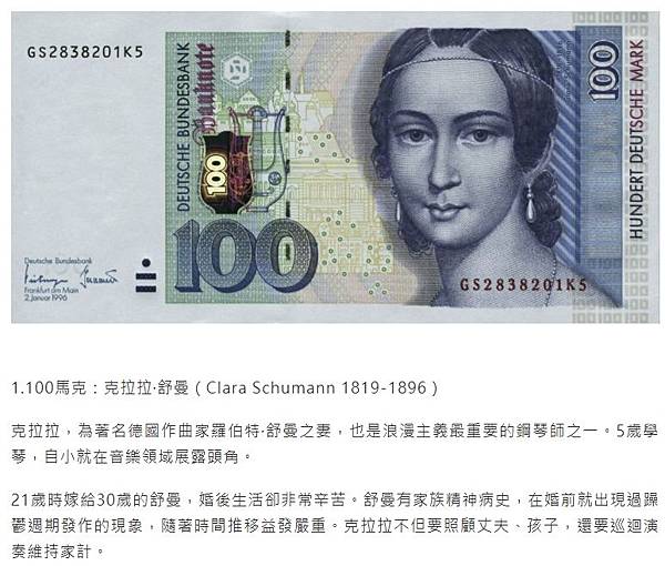 在歐洲,出現在鈔票上的人物除了政治家外,科學家,以及藝術家們也常常入選。舉例來說,高度重視文化藝術的德國,有不少在文化領域有卓越貢獻的人士成為票面人物,當中最引人矚目的,有3位女性: