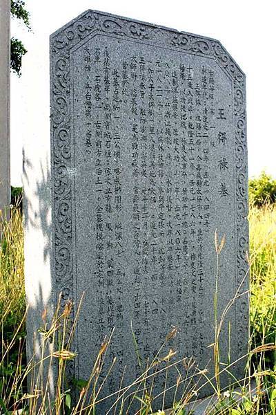 道光二十一年(西元一八四一年)鴉片戰爭期間,王得祿駐防澎湖,是年十二月病逝於防次,享年七十二歲。至道光二十四年(西元一八四四年)營葬此地,墓園寬宏,寶城石柱雕飾麒麟、鳳凰、獅、象,又有二列石象生,依序為翁仲、石馬、石羊、石虎、備享一品官員的殊勞。墓碑中書「誥授建威將軍、晉加榮祿大夫,歷任福建浙江提督、二等子爵世襲,贈伯爵、太子太師,賜諡果毅,顯考王公塋」,得見王得祿一生輝煌的記錄。其旁兩側書其夫人范、陳二氏,得見夫婦合葬,鶼 情深。