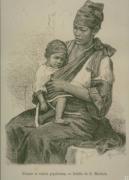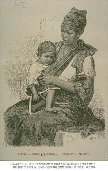 平埔母親和小孩,原作由英國攝影師約翰·湯姆森 1871 年攝於木柵(現高雄內門),雖然還有100年的差距,但可以從畫面中遙想金娘的裝扮。資料來源:維基百科