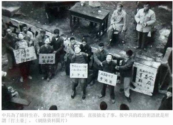 中共進入鄉村後,為了維持生存,首先把眼睛盯住了第一塊財富,用的是古往今來土匪的老辦法,就是拿槍頂住富戶的腰眼,直接搶走了事。按中共的政治術語就是所謂「打土豪」。所以井岡山時期,中共的部隊每到一處,都要「打土豪」。