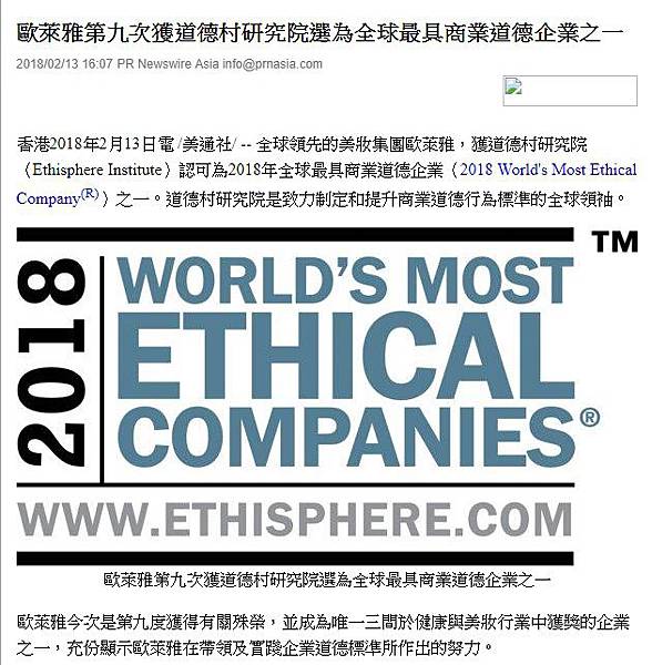 香港2018年2月13日電 /美通社/ -- 全球領先的美妝集團歐萊雅,獲道德村研究院 (Ethisphere Institute)認可為2018年全球最具商業道德企業(2018 World's Most Ethical Company(R))之一。道德村研究院是致力制定和提升商業道德行為標準的全球領袖。