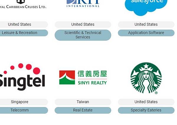 其中亞洲企業僅有六家,除了信義房屋之外,分別是香港的採購業者Connor、印度的塔塔汽車(Tata)與資訊科技服務公司威普羅(Wipro)、日本的花王、與新加坡電信(Singtel)。