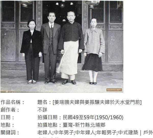 題名:[姜瑞鵬夫婦與姜振驤夫婦於天水堂門前]-客家雲 Hakka Cloud - https://goo.gl/fBW1YM