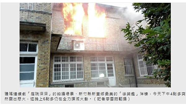 位於新竹縣新豐鄉的「徐榮鑑」洋樓曾是瓊瑤連續劇「庭院深深」的拍攝場景,卻於8日下午4時許傳出火警,甚至有人一度受困其中。消防人員趕到現場,順利救出受困民眾,但因屋內多為木造建材,火勢一發不可收拾,直到晚間6時許仍在灌救。據悉,洋樓已有近80年歷史,如今恐付之一炬,讓人相當惋惜。