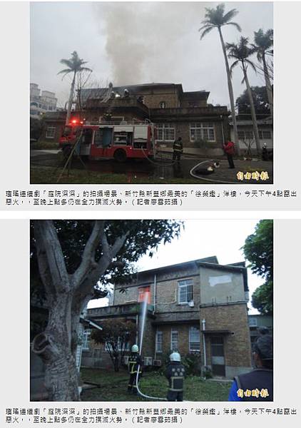 新竹縣新豐鄉的「徐榮鑑」洋樓8日下午4點多,突然傳出火警,屋主和外籍看護3人驚險逃出,由於屋內多為木造建材,火勢一發不可收拾,消防隊抵達到連忙滅火,直到晚間7點才將火勢撲滅,不過2樓近200平方公尺面積受損嚴重,這也是近30年前電視劇《庭院深深》的場景,巧合的是起火點和劇中在同一位置,所幸無人傷亡。