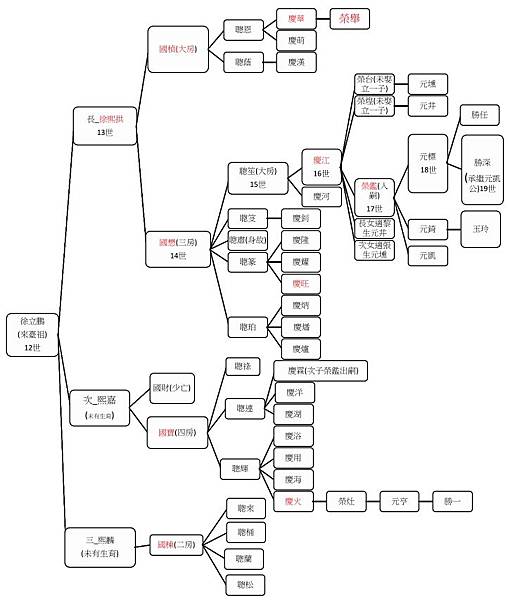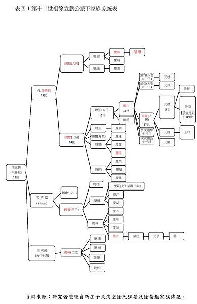 在徐立鵬過世之後,至日本統治前的一百二十餘年,徐家均採「徐熙拱」為名以陞科納供。新庄子東海堂徐家除了使用「徐國和」公號經營莊業、參與廟會及其他公益活動外, 338 尚有比較少用的「徐榮昌號」 339 以及道光 29 年(1849)汪文東又將「汪仰詹」所屬的萃豐莊莊業,轉賣給由徐家與竹塹曾家合組的「曾國興」公號。 340在徐熙拱之後,四大房以新庄仔為中心,由派下成員輪流經管徐家田業與家族事務: