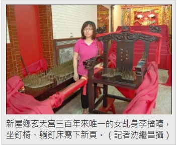 新屋鄉玄天宮三百年來唯一的女乩身李擂瑭,坐釘椅、躺釘床寫下新頁。(記者沈繼昌攝)