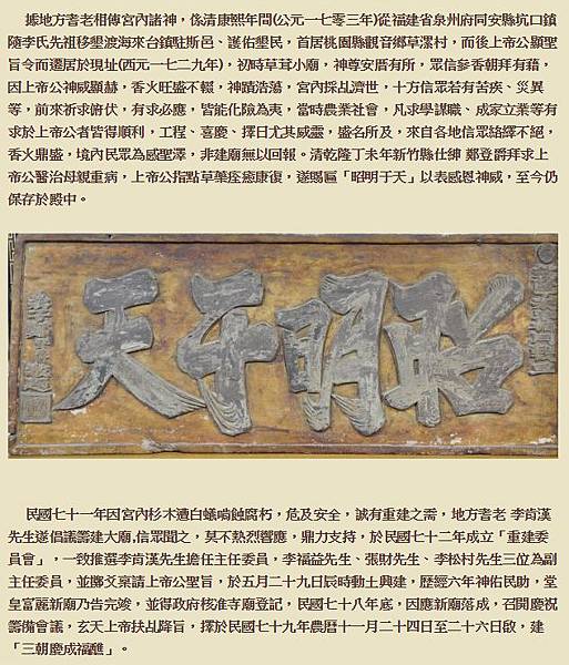 據地方耆老相傳宮內諸神,係清康熙年間(公元一七零三年)從福建省泉州府同安縣坑口鎮隨李氏先祖移墾渡海來台鎮駐斯邑、護佑墾民,首居桃園縣觀音鄉草漯村,而後上帝公顯聖旨令而遷居於現址(西元一七二九年),初時草茸小廟,神尊安厝有所,眾信參香朝拜有藉,因上帝公神威顯赫,香火旺盛不輟,神蹟浩蕩,宮內採乩濟世,十方信眾若有苦疾、災異等,前來祈求俯伏,有求必應,皆能化險為夷,當時農業社會,凡求學謀職、成家立業等有求於上帝公者皆得順利,工程、喜慶、擇日尤其威靈,盛名所及,來自各地信眾絡繹不絕,香火鼎盛,境內民眾為感聖澤,非建廟無以回報。清乾隆丁未年新竹縣仕紳 鄭登爵拜求上帝公醫治母親重病,上帝公指點草藥痊癒康復,遂賜匾「昭明于天」以表感恩神威,至今仍保存於殿中。