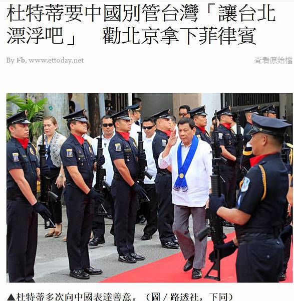 菲律賓總統杜特蒂(Rodrigo Duterte)19日先是開玩笑稱,菲律賓很願意成為「中華民國」(編按:杜特蒂用詞為Republic of China,應為口誤)的一省,展現出他親中的態度,在同個場合又勸告中國別再理會台灣,「就讓台北在那吧,它非常小,讓它漂浮吧!如果你拿下菲律賓,將不會有任何問題。」