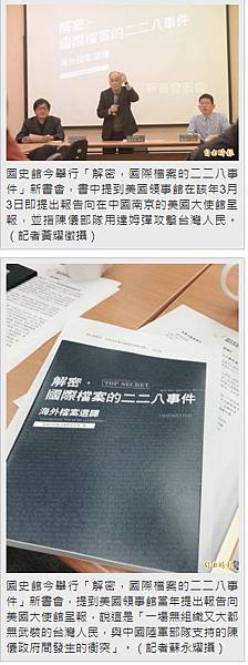國史館今舉行「解密,國際檔案的二二八事件」新書會,提到美國領事館當年提出報告向美國大使館呈報,說這是「一場無組織又大都無武裝的台灣人民,與中國陸軍部隊支持的陳儀政府間發生的衝突」。(記者蘇永耀攝)