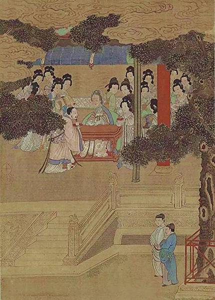 許負端詳薄姬,言面相尊貴,有帝王之氣,預言「薄姬他日必為龍母」。圖爲明 仇英《漢宮春曉》局部。(公有領域)