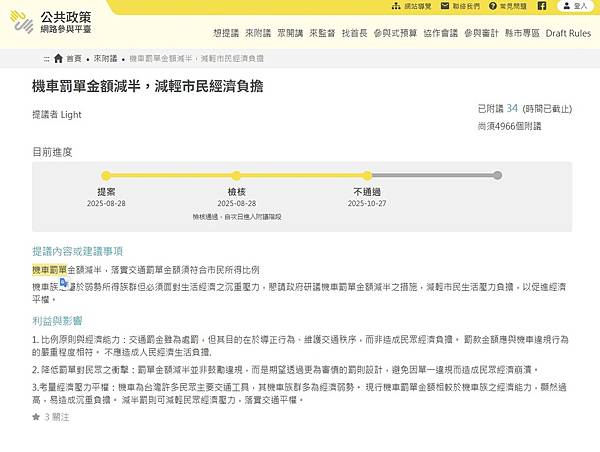 機車罰單金額減半,減輕市民經濟負擔- 提點子 -公共政策網路參與平臺 https://bit.ly/4r5Sl3Z