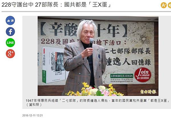 分享228守護台中 27部隊長:國共都是「王X蛋」到Facebook 分享228守護台中 27部隊長:國共都是「王X蛋」到Line 分享228守護台中 27部隊長:國共都是「王X蛋」到Google+