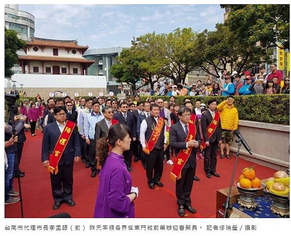 台南市代理市長李孟諺(前) 昨天率領各界在東門城前舉辦迎春祭典。 記者修瑞瑩/攝...