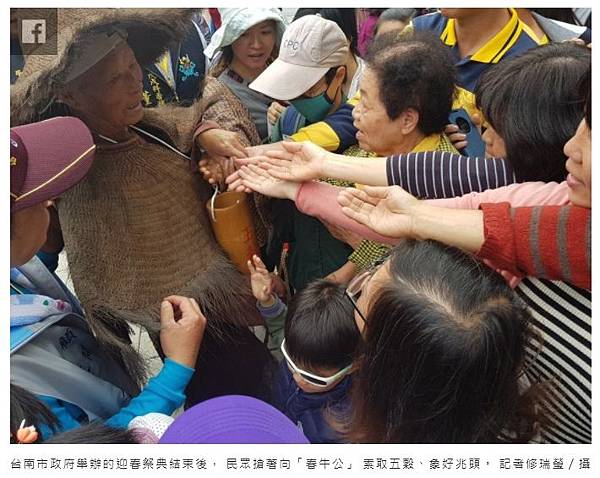台南市政府舉辦的迎春祭典結束後, 民眾搶著向「春牛公」 索取五穀、象好兆頭。 記...