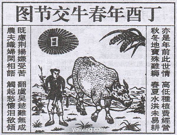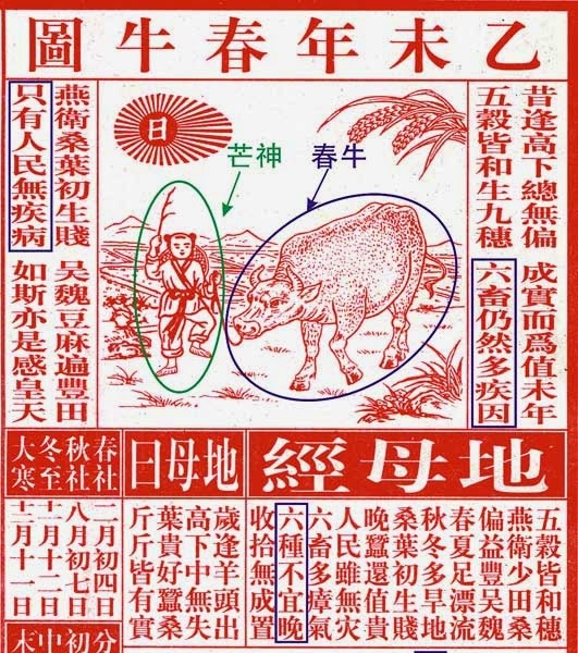 春牛圖左右兩旁分別載有七言詩句,這些詩句是預測當年的天氣及農作收成。