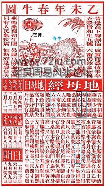 而牧童的年齡也有喻意,孩年的牧童代表逢季年(就是辰戌丑未年);壯年的牧童代表逢仲年(就是子午卯酉年);老年的牧童是逢孟年(就是寅申巳亥年)。另外如果牧童站在牛身中間,表示當年的立春在元旦前五天和後五天之間;牧童站在牛身前面,表示當年的立春在元旦五天前;牧童站在牛身後面,表示當年的立春在元旦五天後。