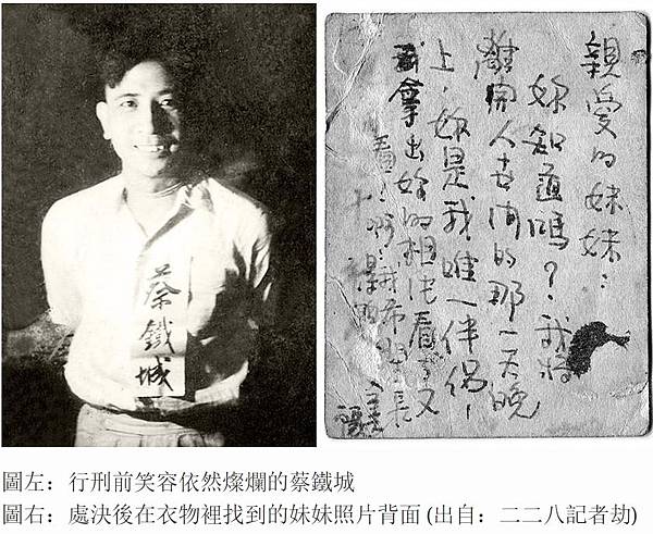 ▲▼圖左:行刑前笑容依然燦爛的蔡鐵城圖右:處決後在衣物裡找到的妹妹照片背面 (出自:二二八記者劫) 。(圖/聚珍臺灣授權提供,請勿隨意翻拍,以免侵權。)