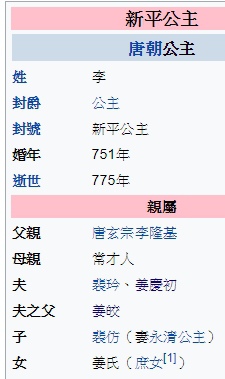 新平公主自小聰慧,好讀書,嫁給了出身河東東眷房裴氏的太僕卿裴玪(裴竑、唐睿宗女霍國公主駙馬裴虛己的弟弟)。裴玪去世後,天寶十載(751年),新平公主改嫁姜皎的兒子姜慶初。姜皎的外甥李林甫推薦姜慶初為駙馬。
