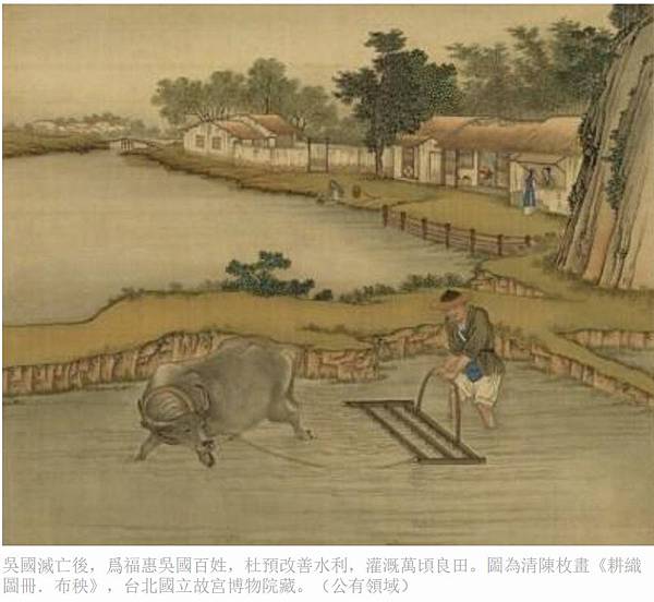 吳國滅亡後,爲福惠吳國百姓,杜預改善水利,灌溉萬頃良田。圖為清陳枚畫《耕織圖冊.布秧》,台北國立故宮博物院藏。(公有領域)