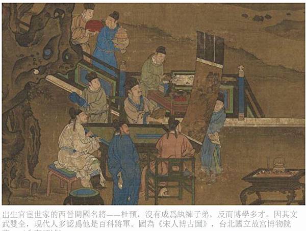 出生官宦世家的西晉開國名將——杜預,沒有成爲紈褲子弟,反而博學多才。因其文武雙全,現代人多認爲他是百科將軍。圖為《宋人博古圖》,台北國立故宮博物院藏。(公有領域)