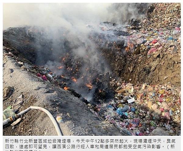環保局說,竹北新豐區域垃圾掩埋場占地約9公頃,目前暫置地面上的新舊垃圾約有10萬噸(含2萬打包垃圾),由於沼氣加上氣候乾燥、周邊乾草,每年都會發生數起自燃。竹北新豐掩埋場又燒了! 火勢撲滅持續監控防復燃 - 社會 - 自由時報電子報 https://bit.ly/3feS4br