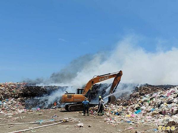 新竹縣竹北新豐區域垃圾掩埋場火警,消防隊員全力滅火。(新竹縣消防局提供)