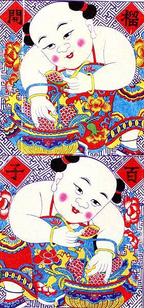 圖:希望多生多育的《榴開百子圖》(清代·山東濰坊楊家埠版畫)
