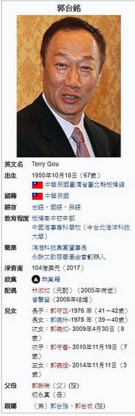 郭台銘(英文名:Terry Gou,1950年10月18日-)[1],台灣企業家,生於台灣臺北縣板橋鎮,板橋高中初中部、中國海事專科學校(今台北海洋科技大學)畢業,是鴻海精密董事長、富士康科技集團總裁,以及永齡文教慈善基金會創辦人。以個人資產2283億台幣名列富比士億萬富翁列表中的第182大富豪,同時也是台灣首富[2]。
