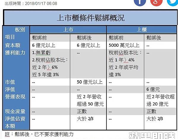 至於上櫃部份,將免除獲利能力和資本額要求,且只需符合淨值6億元,且近2年營收超過20億元即可,以及淨值占資本額都須超過3分之2等基本門檻。