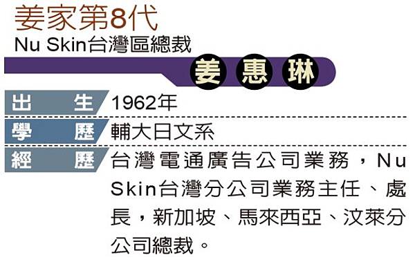 目前執掌NU SKIN全球超過一半的業務,創下該職務有史以來華人最高位階紀錄的姜惠琳,除了謹記家訓,也認為自己承襲祖父的作風,而能有現在的成就。