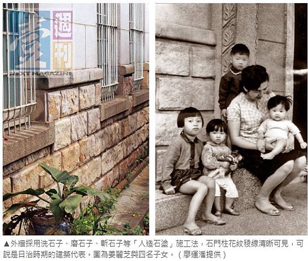 外觀展現多種高難度且精巧的泥作工法,牆面雕花等裝飾有洗石子,抿石子,磨石子、斬石子、大理石、貼馬賽克等不同樣貌;正立面基礎及牆裙部分採用大塊石材,顯得大器;洋樓基座及圍牆的唭哩岸石採自北投,可想見其費工程度。